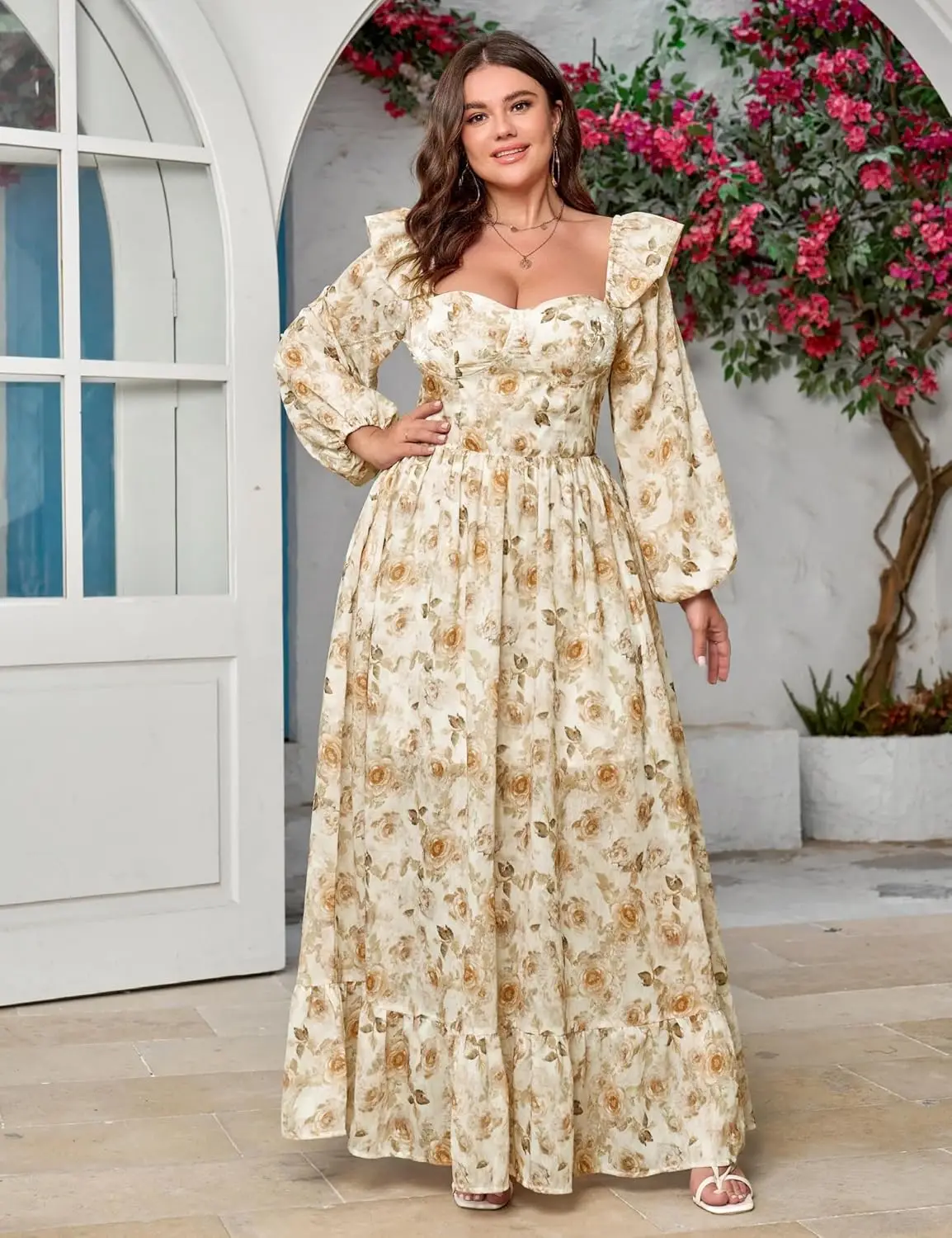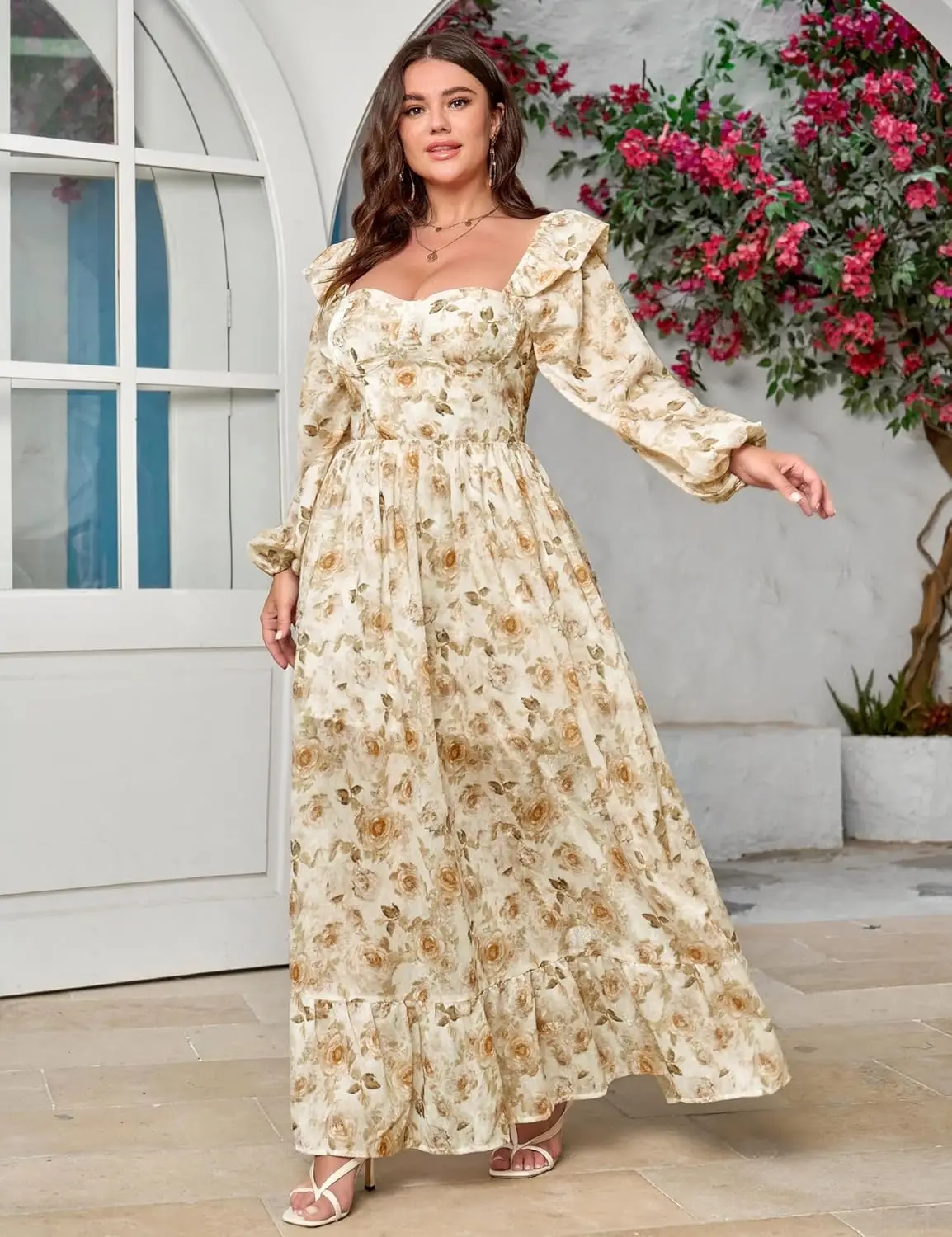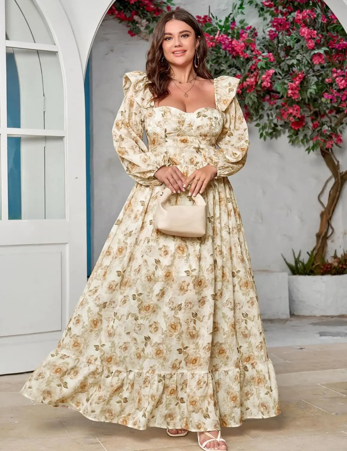 Women's Casual Boho Floral Puff Long Sleeve Maxi Dress Summer Style Chiffon Flowy Smocked Square Collar Woven for Autumn Seasons